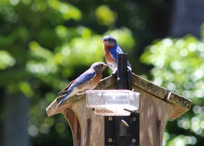 Then Mimi, put a little bird food on her Bluebird feeder and instantly her Bluebirds descended on cue. She has watched them grow up and leave the nest. It was fun for me to observe them more closely than ever before.