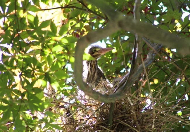 I managed to get a few artsy shots at the fuzzy little herons. There was strong backlighting and they were in the shade, so it was a struggle to get a good image of them. It was the first time I have ever seen a Green Heron nest and its young.