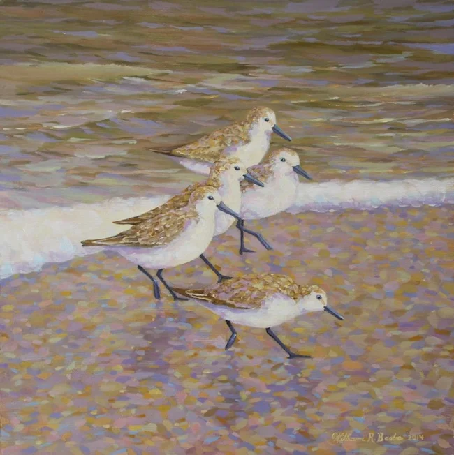 The incoming waterline is sure to get them moving on to the next location to forage for food in the wet sand. I never tire of watching them when at the beach. I also enjoy painting them and trying to capture their spontaneous personality.