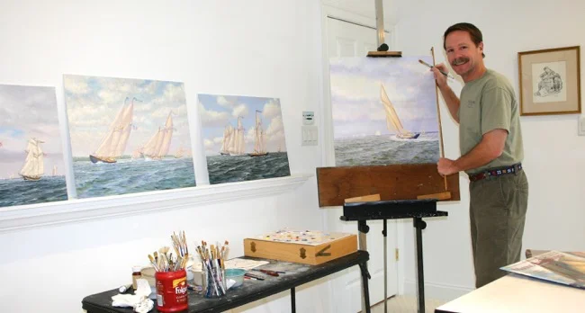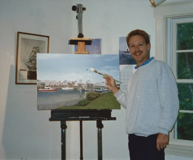 The first 12 years of my painting career were spent in Maine. I loved painting the little coastal villages, lighthouses, lobsterboats, and historic wooden schooners. Out of those 12 years, 9 of them were spent working as the resident artist for MBNA painting oil paintings of their office buildings around the world. I also spent a good bit of my time with MBNA continuing to build my body of Maine paintings.
