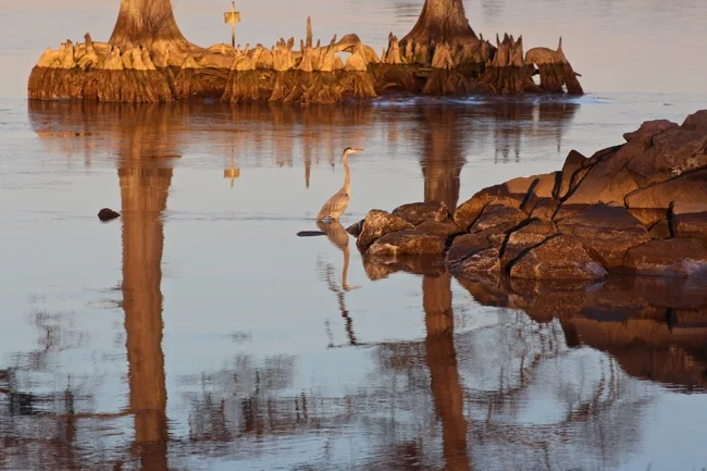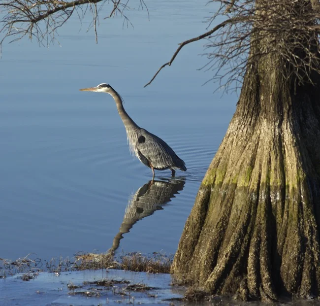 The moon was mirrored in the water! The Blue was standing between two Cypress trees and I was seeing double, the reflections were so strong. I always take a picture or two from a distance because many times as I approach Blue Herons they will take off and fly away. This time was different. A lunar spell must have been cast over this Blue Heron because he couldn’t have cared less that I was there. He was soaking in both the warmth of the sun and drawing in the moon’s energy.
