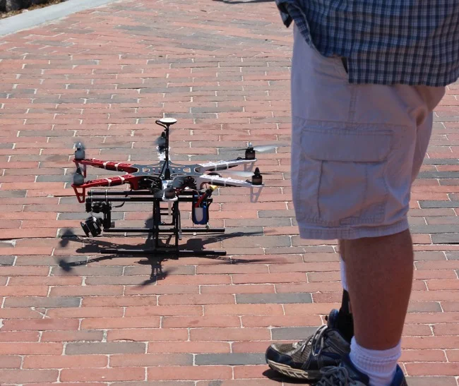 As I was walking to the other end of the River Landing, to take pictures of the ship’s bow, I saw something buzz by my head. I looked up to see a DRONE! It was cruising slowly over to its owner and controller. He had his control unit in his hand. The drone landed softly on the ground next to him. I realized what I thought was a small plane in the distance while I was photographing, was actually a drone flying all around the Hermione.