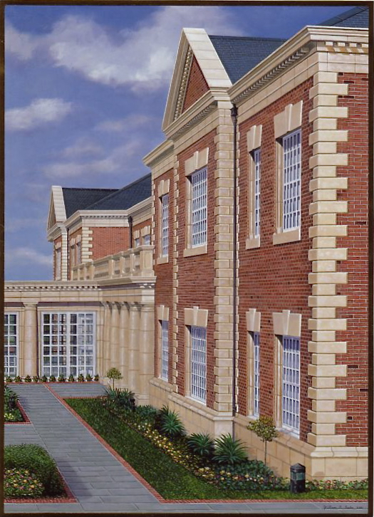 It has become one of my favorites of the many office building paintings I painted over my 10 years with MBNA. The Chester office building epitomizes the “attention to detail” philosophy, including many architectural elements like cornerstones, dental moldings, pediments, sills, pillars, slate sidewalks lined with bricks, etc…