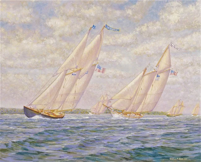 One of my paintings of the Schooner Virginia, entitled Leading the Way, features the Virginia (black schooner) racing on the Chesapeake Bay, being challenged by another state replica ship the Spirit of South Carolina (white schooner).