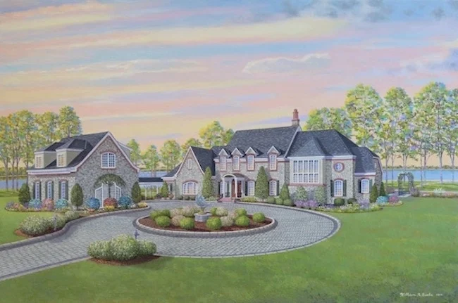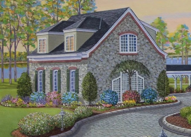 Fittingly, late in the day I finished my painting of this beautiful stone home. The sunsets over the river are usually quite colorful, ranging in various hues of yellow, pink, blue, and violet. Creating a painting with early evening lighting, sometimes referred to as the “golden hour”, offered an opportunity for me to not only have fun with color but to work with strong lights and darks.