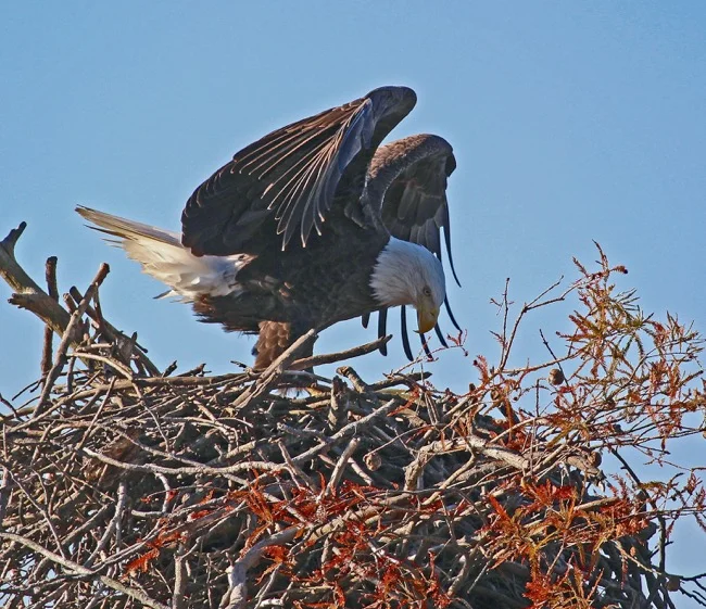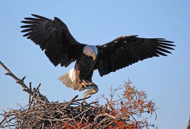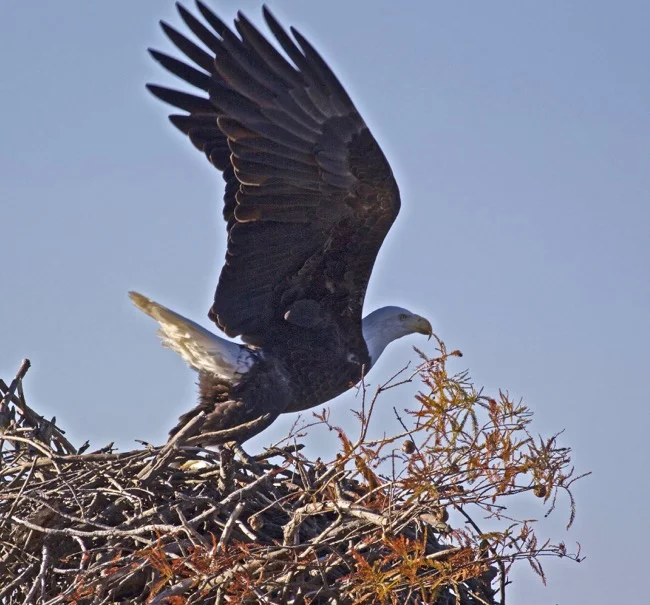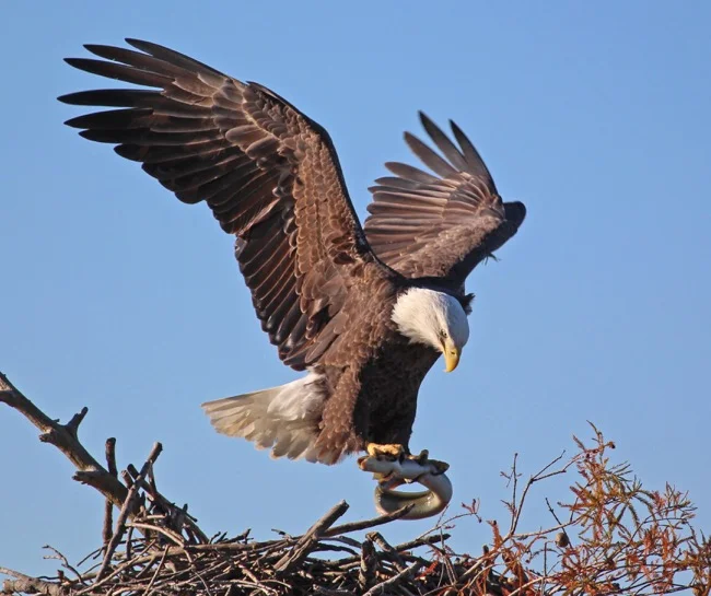 It all happened so fast. It was a powerful moment. The mighty, majestic eagle’s wings were spread, its sharp talons clasping the helpless eel, deeply penetrating the tough, slippery skin. The eagle settled into the osprey nest and then raised its wings several times to reposition itself.
