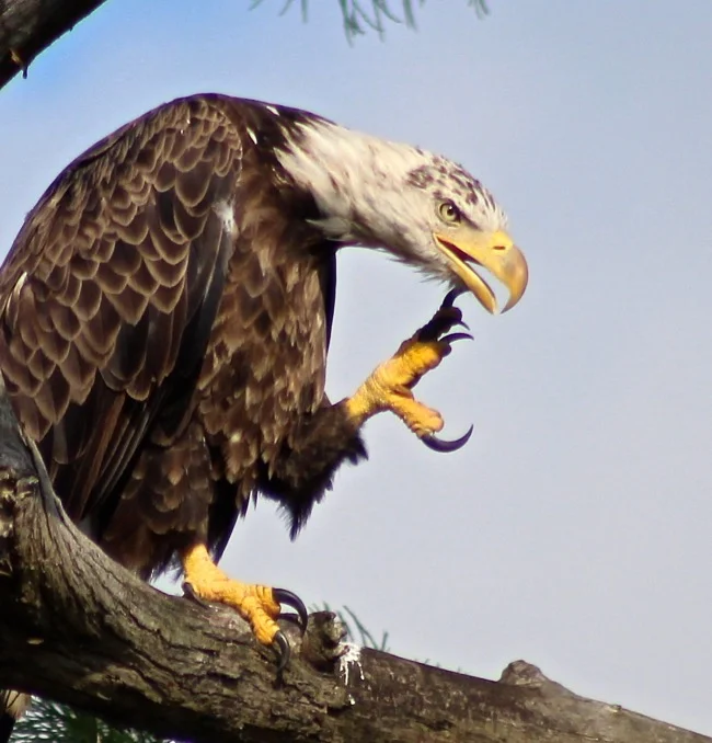 This eagle flew right over me and landed in the pine trees behind me. After screeching a few times it decided to shake its feathers. I’ll always recognize this one as the brave one that flew right at me and didn’t care about my camera or me.