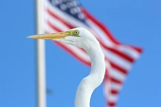 I will always remember this Great White Egret striking a pose alongside the American Flag. We pulled over to the side of the Florida Keys highway at a seafood restaurant where the fishermen were feeding the pelicans. This egret had most likely eaten since it was content with posing for my camera.