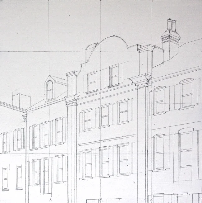 Since I love color and charming architecture, I thought my first painting of Charleston should be a painting of Rainbow Row. I know some might find it cliché and an uncreative choice but I would have to kindly disagree. The row of 13 homes creates a wide horizontal setting. I chose to square off a section and focus in on the roofline from a unique perspective.