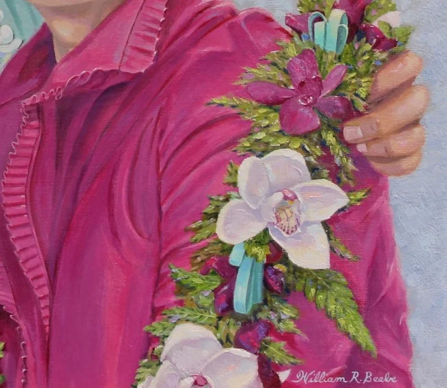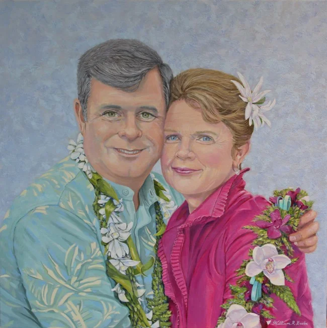 The moment in time is a family wedding in Hawaii, one of their favorite places on earth. The couple is depicted cheek to cheek with twinkles in their eyes. Wrapped in Hawaiian leis with Cymbidium and Dendrobium orchids, the leis envelop and unite them. Byllie Ann has a Spider Lily arrangement in her hair as is traditional in Hawaiian ceremonies. Larry’s Hawaiian shirt goes wonderfully with the flowers and instantly helps identify the location~ paradise.