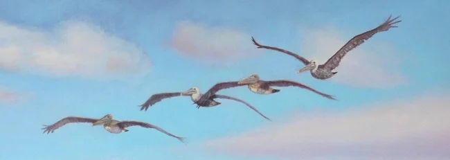 Fortunately, having taken thousands of photographs of Brown Pelicans, I had plenty of material to work with. I liked this particular formation because the big Brown in the lead is casting a glance toward his admirer on the balcony and taking his followers on the scenic route by a beautiful home. The V-formation of the wings of the last Brown on the right side of the painting creates some movement to the otherwise glider-like wings of his companions. I think it also adds a nice uplifting touch to the painting.