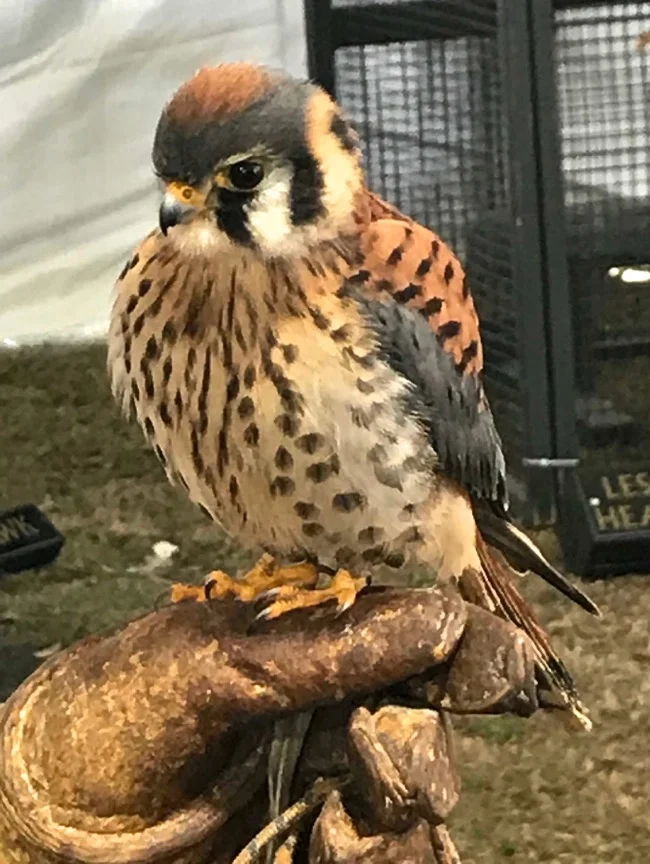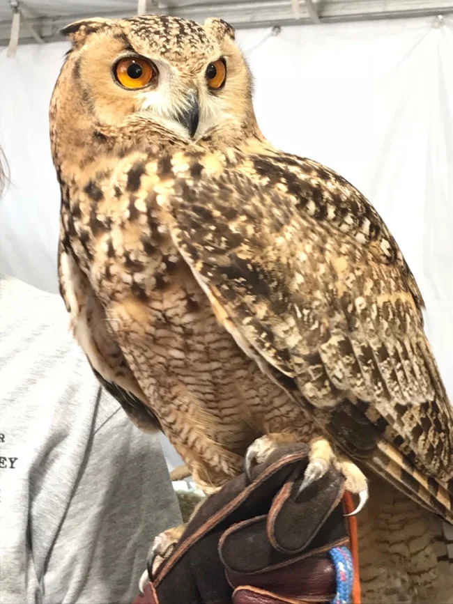 Other SEWE venues included flyfishing demos, hunting displays, Jack Hanna and his animals, Jeff Foxworthy and his art! We spotted decoy carvers out front of the Audubon Gallery storefront on King Street. We loved seeing our first flight demonstration by Birds of Prey (a local bird rescue and rehab organization). Harris's Hawks flew from the tops of nearby buildings, landing on the arm of their trainer. A variety of owls flew from perch to perch, showing off their beautiful big eyes and patterned wings. They had a tent where we could get within a few feet of the birds. Here are a few pics!
