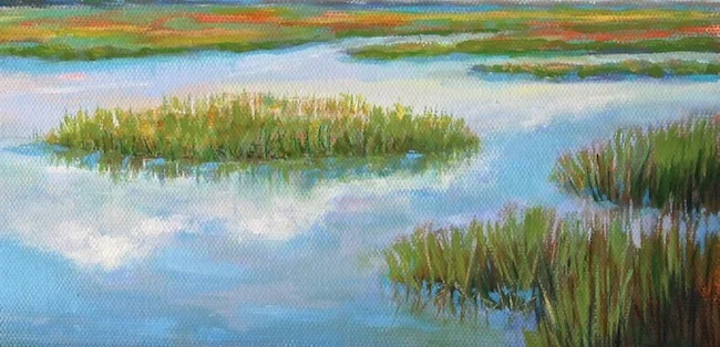 This painting, entitled Lowcountry Reflections is on a relatively small canvas, 11” by 14”. I worked in my studio from my photos, recalling how big the sky seemed, with the wall of clouds receding off into the distance along with the meandering tidal creek. The sky was a beautiful blue, the grasses a summer green with some warm brown grasses remaining from early spring, and the colors were all reflected on the glassy surface of the shallow water.