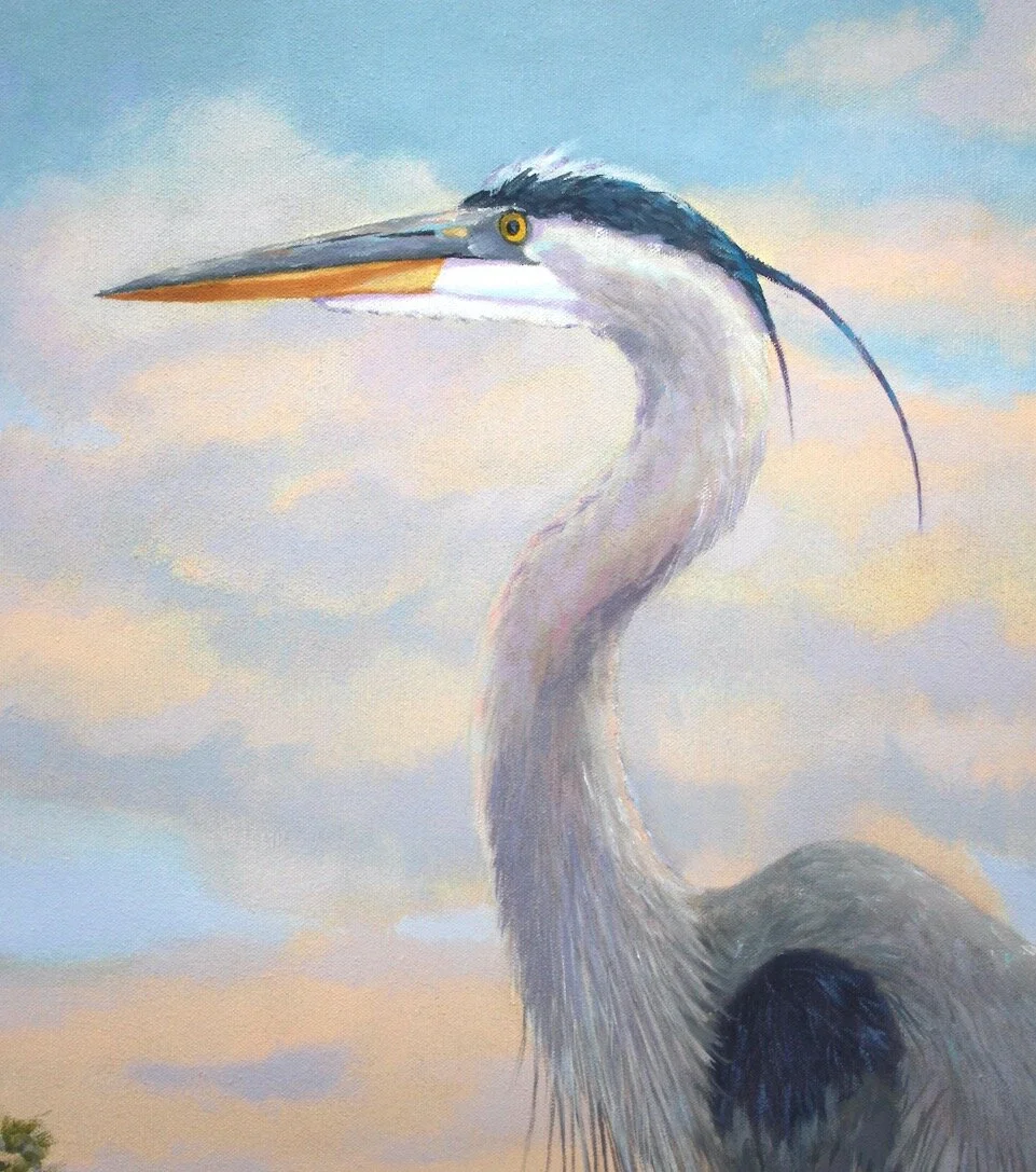 I love working with a collector to create a painting that represents their vision and mine. I was commissioned to paint a large 40” by 30” Great Blue Heron in a Lowcountry setting with marsh grasses. They specifically wanted a vertical piece featuring one of my favorite birds, the Great Blue Heron, with an evening, orange glow about him. They chose this particular stance/pose from one of my images and I worked with them on creating a background and sky that would bring their vision to life.