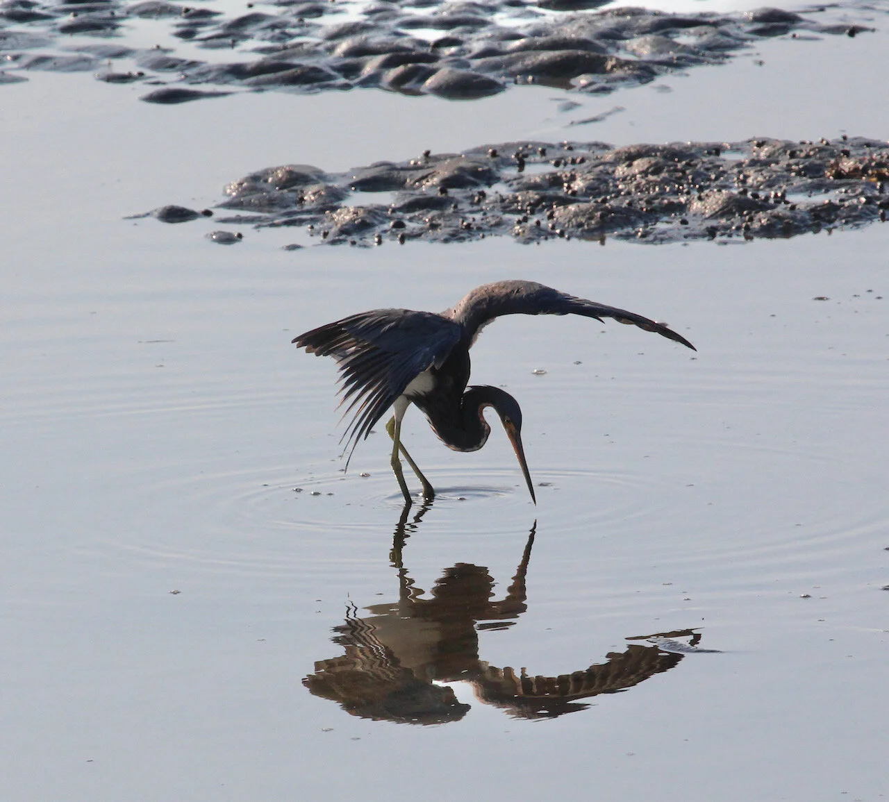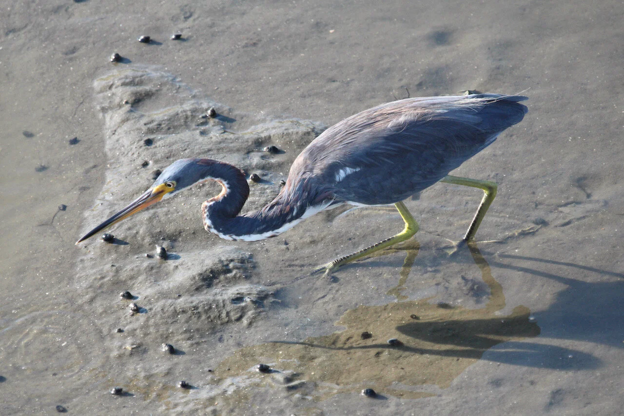 The bridge at low-tide stands a good 15-20 feet up above the water, so I was also shooting down at my subjects, which usually makes for disappointing images. This time, however, my vantage point gave me a birds-eye view of some unusual antics by the Tricolored Heron.