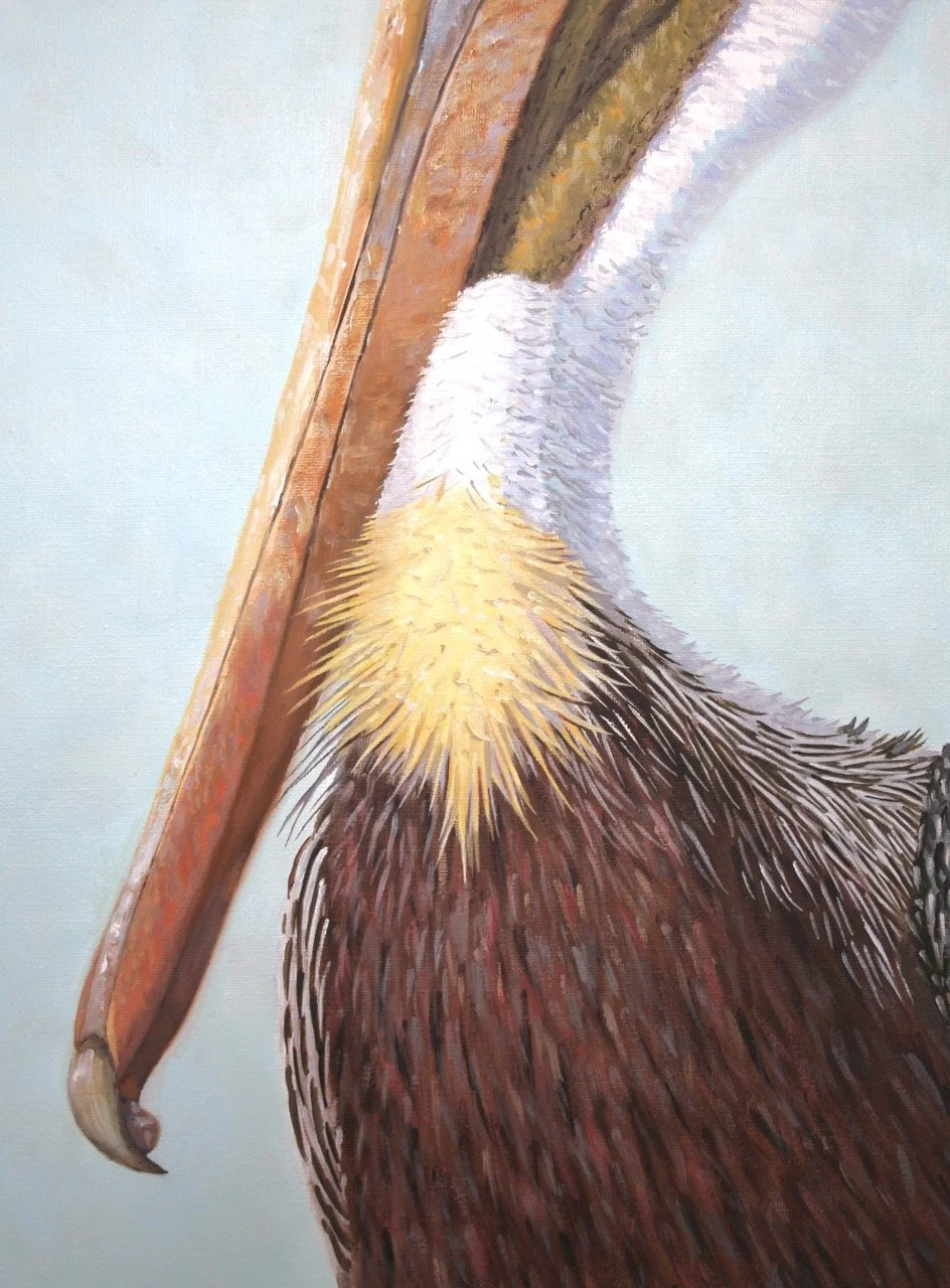 Whenever I get ready to start a new pelican painting I look for characteristics that stand out. I search through all my photographs until I find a pelican that I keep going back to. I chose this latest image to paint because the bird has a certain panache. His stylish tuft of feathers, his self-confident look posing with his head up and back, and the resemblance of a yellow ascot on his neck, all led me to believe this pelican was the one!