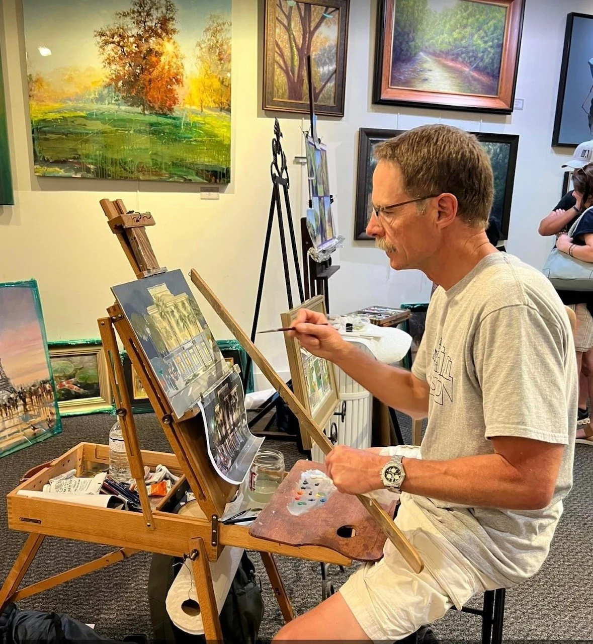 I’ve been wanting to paint this nighttime scene of The Vendue Hotel for awhile. I took the image one night when things had opened back up after Covid. It was so good to see the town of Charleston alive again. Mary Martin Gallery asked me if I could come and paint at the gallery this past Saturday. The gallery was hosting an all day paint-in for children of all ages and the thought was that gallery artists like myself might help to inspire the young budding artists.